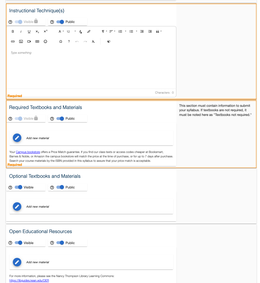 Instruction Technique; Required Textbooks and Materials; (Optional Textbooks, OER)