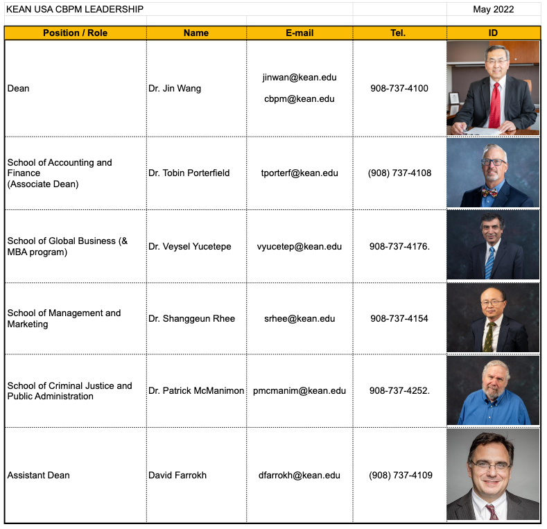 | Dean | Dr. Jin Wang | jinwan@kean.edu cbpm@kean.edu |