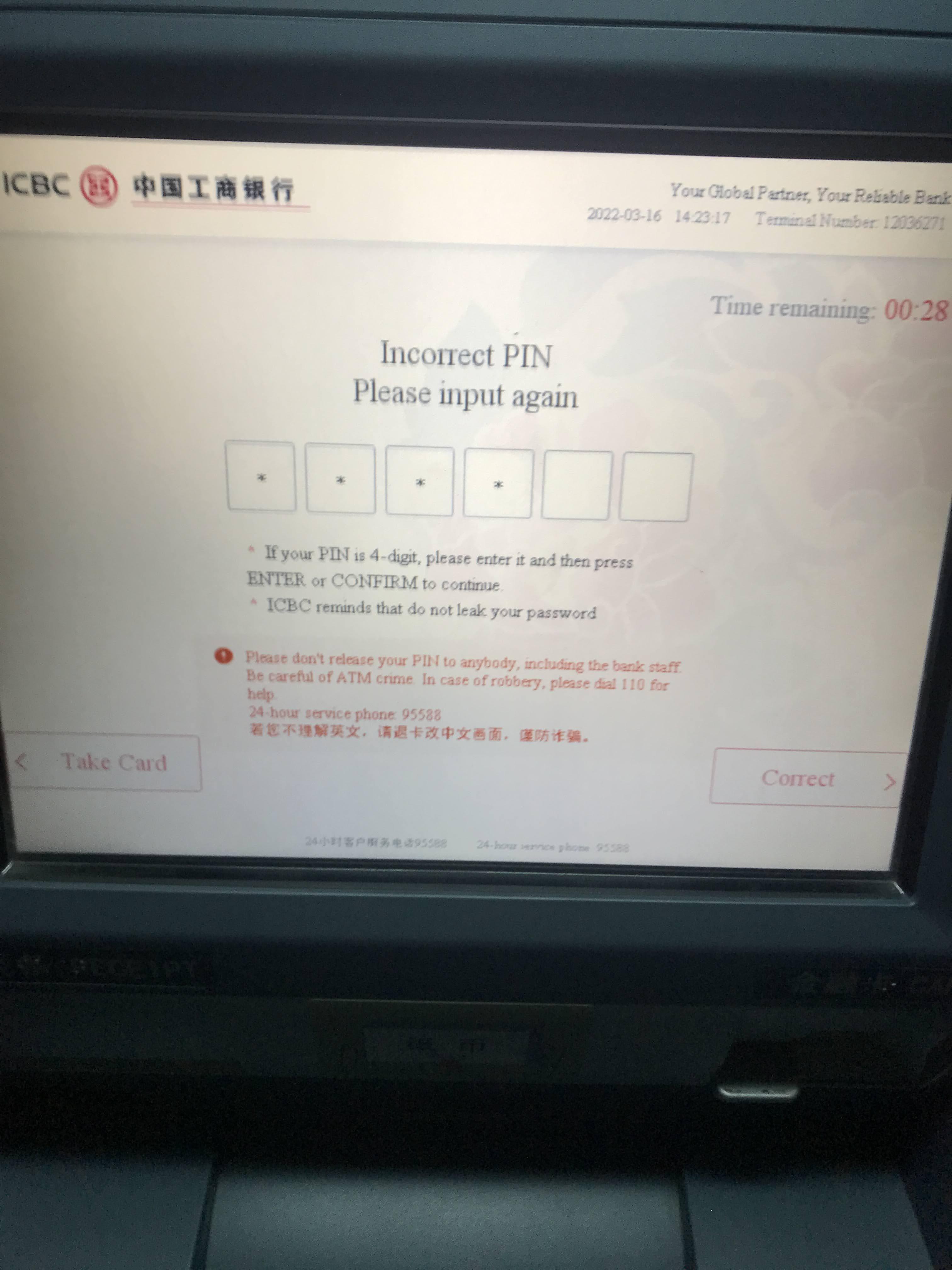 If you're wroing in Password more than several time (around three times), ATM automatically lock your account.