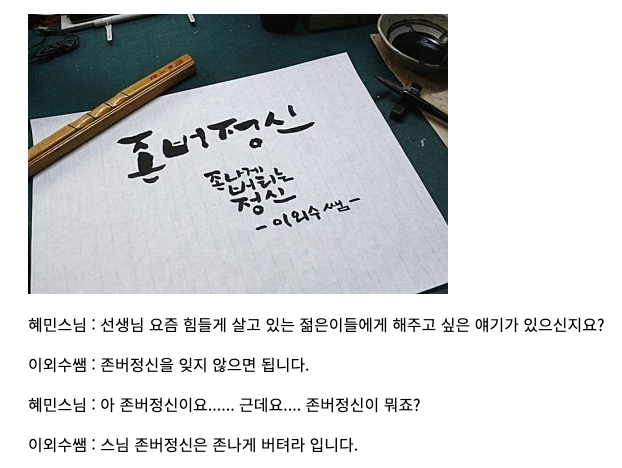 이외수씨의 '마음에서 마음으로' 를 읽고 있는데 '존버' 정신이라는 말이 여러번 나온다. 뭔가해서 찾아보니 '존나게 버텨라...'라는 의미로 이외수씨가 퍼트린 말이라고 한다. 아무리 힘들어도