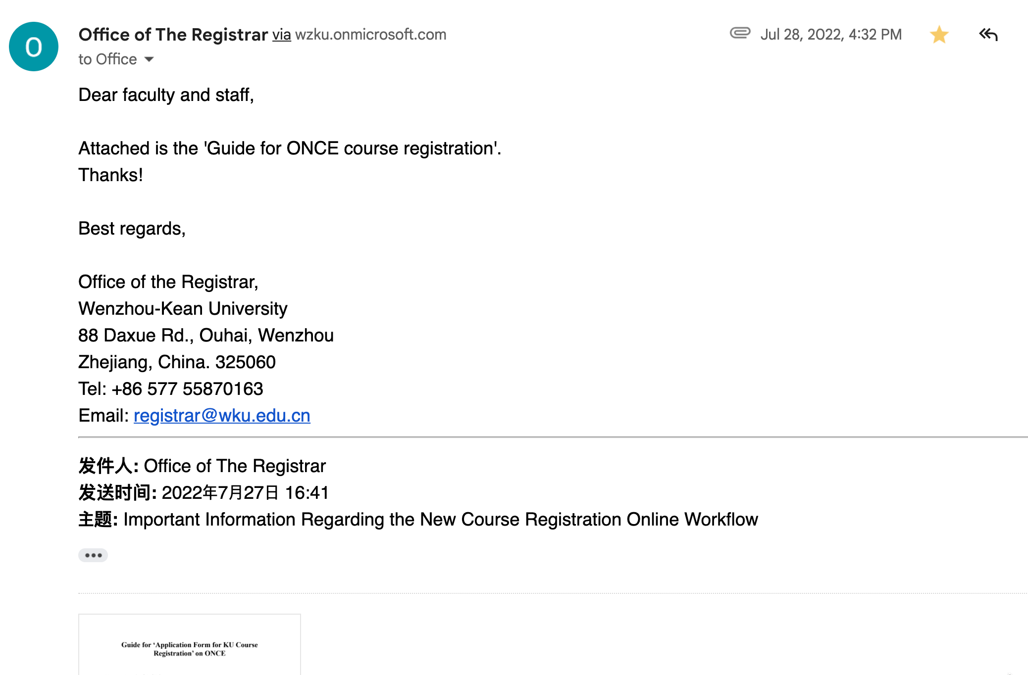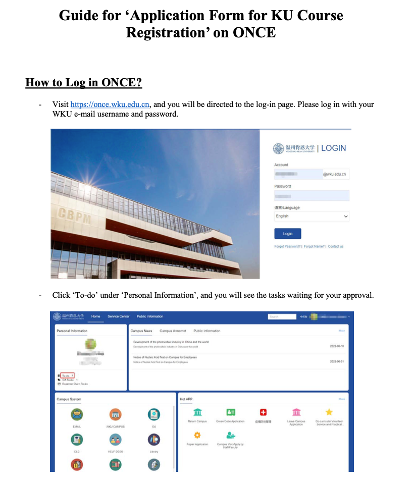 The course registration online workflow in the ONCE platform can be found at https://once.wku.edu.cn (Please log in with your WKU email address and password), and the detailed guide is attached for your reference.
