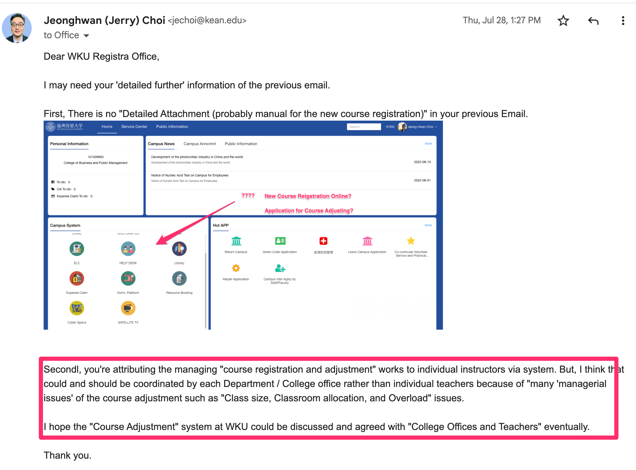 A1: If you forget your WKU email address and password, please reach out to ithelpdesk@wku.edu.cn. If the problem is technical, we suggest you email ithelpdesk@wku.edu.cn and copy registrar@wku.edu.cn. If the problem is related to the workflow design and any other queries, please email registrar@wku.edu.cn.