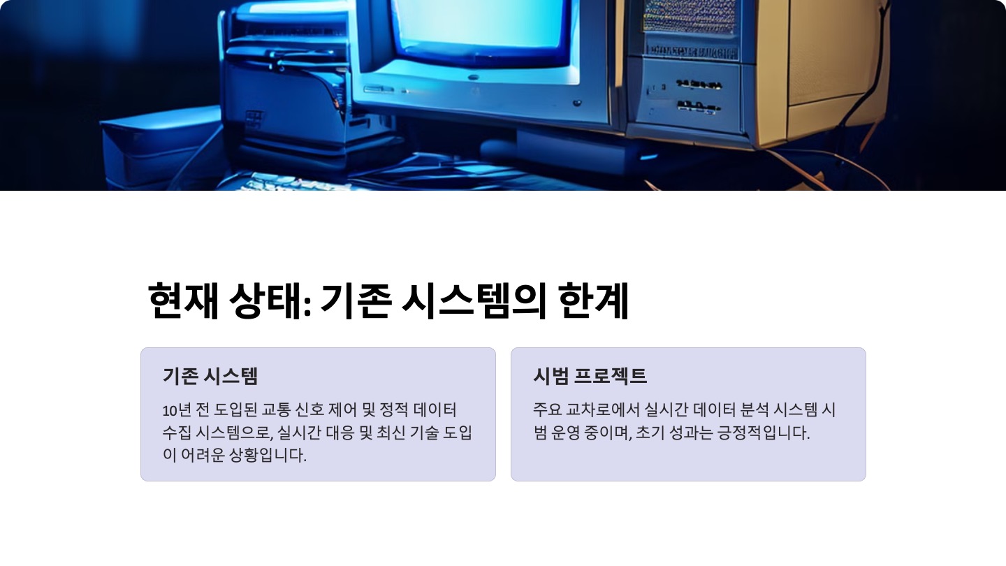 기존 시스템: 10년 전 도입된 교통 신호 제어 및 정적 데이터 수집 시스템으로, 실시간 대응 및 최신 기술 도입이 어려운 상황.