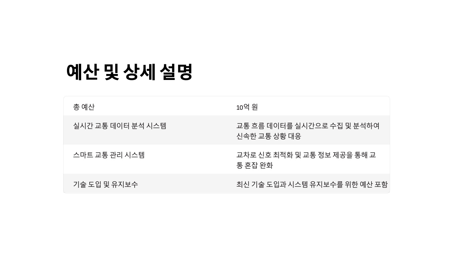 예산 및 상세 설명: 총 예산 10억 원, 실시간 데이터 분석 및 스마트 교통 관리 시스템 도입.