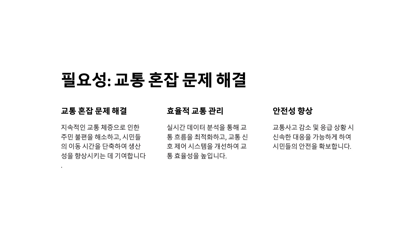 필요성: 교통 혼잡 문제 해결, 효율적 교통 관리, 안전성 향상.