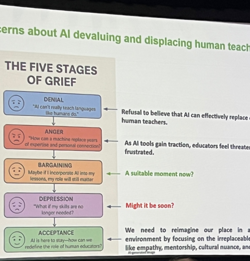 The speaker emphasized the need for educators to reframe their roles—not merely as content deliverers but as facilitators of cognitive dissonance and productive friction with AI. The keynote explored how AI can unlock deeper thinking when learners confront its limitations rather than passively consume its outputs.