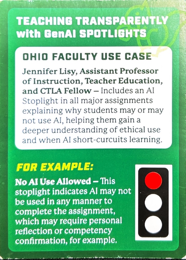 | Transparent Teaching with AI | AI Spotlights and usage declarations foster student trust and ethical engagement. | Adopt Ohio’s “AI Stoplight” model across programs; require AI use statements in key assignments. |